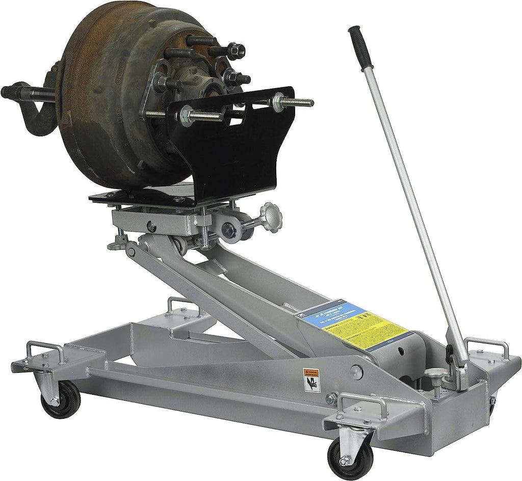 This low-lift transmission jack adapter holds the spindle assembly firmly in place during king pin service. It eliminates the need to completely disassemble the brakes to reduce spindle weight for handling. During service, the spindle assembly can be raised to a comfortable working height while replacing king pin bearings or bushings. Out patented design will work with standard HD truck bolt patterns and wheel stud sizes and adapts to most low-lift transmission jacks.