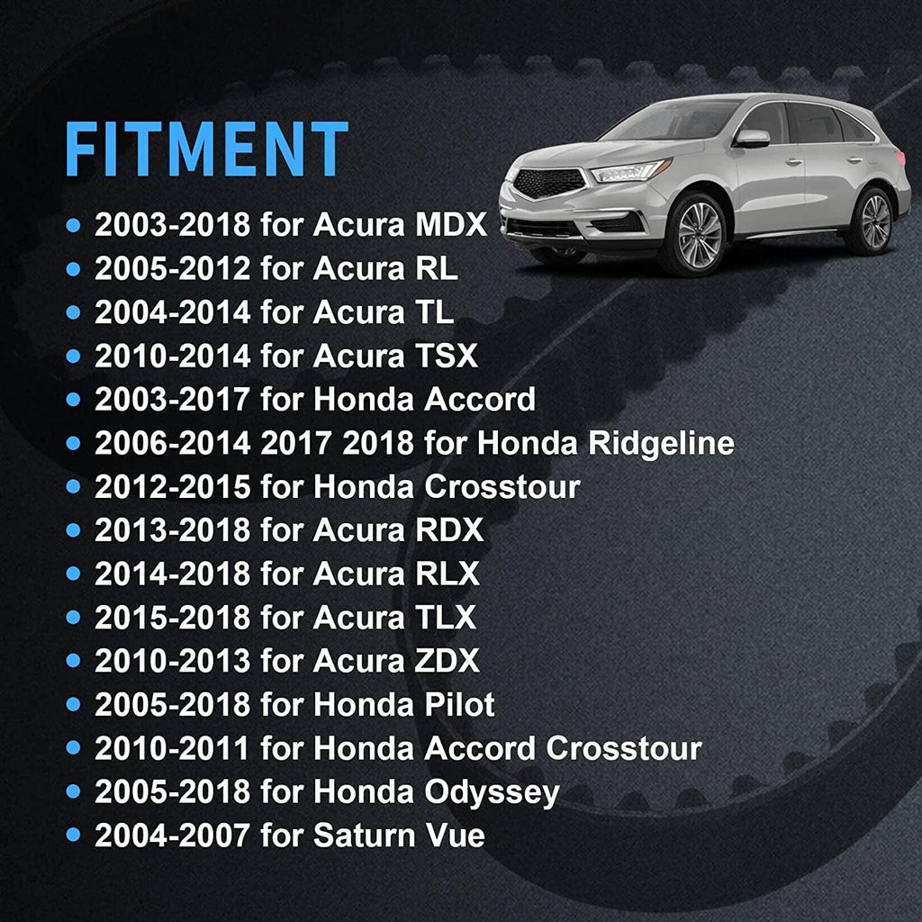 - FITMENT - Timing belt kit fit for 03 04 05 06 07 08 09 10 11 12 13 14 15 16 17 18 for Acura MDX 13 14 15 16 17 18 for Acura RDX 05 06 07 08 09 10 11 12 for Acura RL 14 15 16 17 18 for Acura RLX 04 05 06 07 08 09 10 11 12 13 14 for Acura TL 15 16 17 18 for Acura TLX 10 11 12 13 14 for Acura TSX ZDX 03 04 05 06 07 08 09 10 11 12 13 14 15 16 17 for Honda Accord 12 13 14 15 for Honda Crosstour 05 06 07 08 09 10 11 12 13 14 15 16 17 18 for Honda Odyssey Pilot Ridgeline