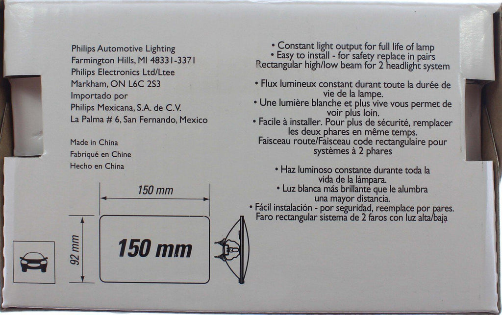 Specifications: Part Category: Headlight Bulb Brand: Phillips Manufacturer Part Number: H4701C1 Vehicle Position: High Beam Placement on Vehicle: High Beam Label: Standard - Single Commercial Pack Product Type: Factory Replacement Type: Headlight Bulb Halogen: Yes DOT Approved: Yes Filament Quantity: 1 Beam Type: High beam Street Legal: Yes Bulb Color: Clear Bulb Base Type: 2 contact lugs Bulb Material: Glass Bulb Technology: Halogen Bulb Finish: Clear Amperage Rating: 4.64 Bulb Type: Standard sealed beam Filament Type: C-8 Length: 3.34 Voltage: 14 Wattage: 65 Interchange Part Number: 18536 Brand Label: Standard - Single Commercial Pack Important Information: