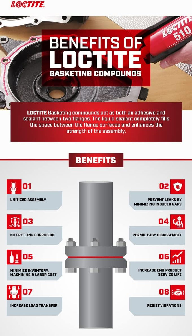 LOCTITE 515 Gasket Maker & Flange Sealant is a flexible gasketing material for use on rigid machined flanges with less than 0.015" (0.381 mm) gap. OEM approved - use where OES specify 515 or "anaerobic" gasket (cures in absence of air). Eliminates preformed, pre-cut, paper, rubber, and cork gaskets. Flexes with flanges that move in service.