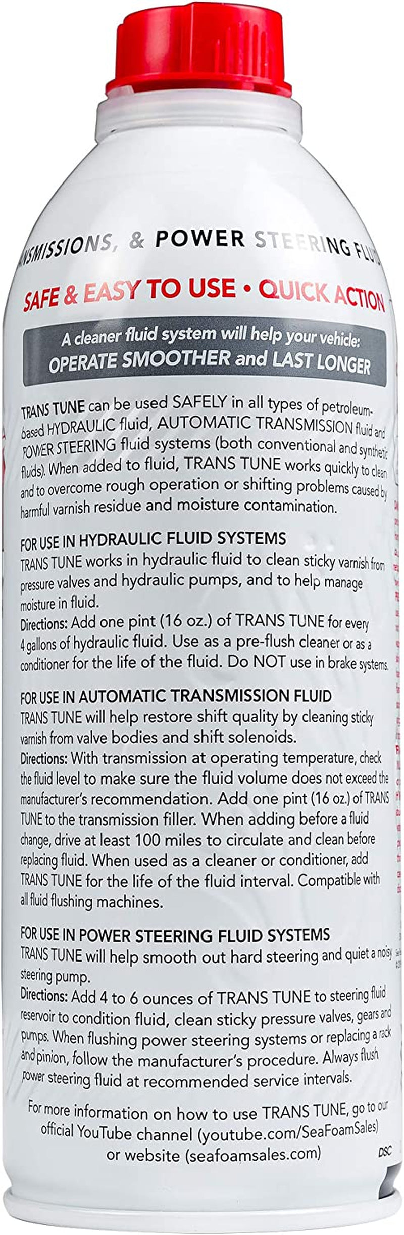 - Specs: Trans Tune, Notes: Cleans and lubricates valve bodies, shift actuators & solenoids, Controls moisture, Dissolves and liquefies harmful gum and varnish buildup in fluid, Helps fluid systems work smoother and last longer, Helps restore shift quality by cleaning sticky varnish from valve bodies & shift solenoids, Safe for conventional and synthetic fluids, Safe in most types of automatic transmission fluid, hydraulics, or power steering fluid systems