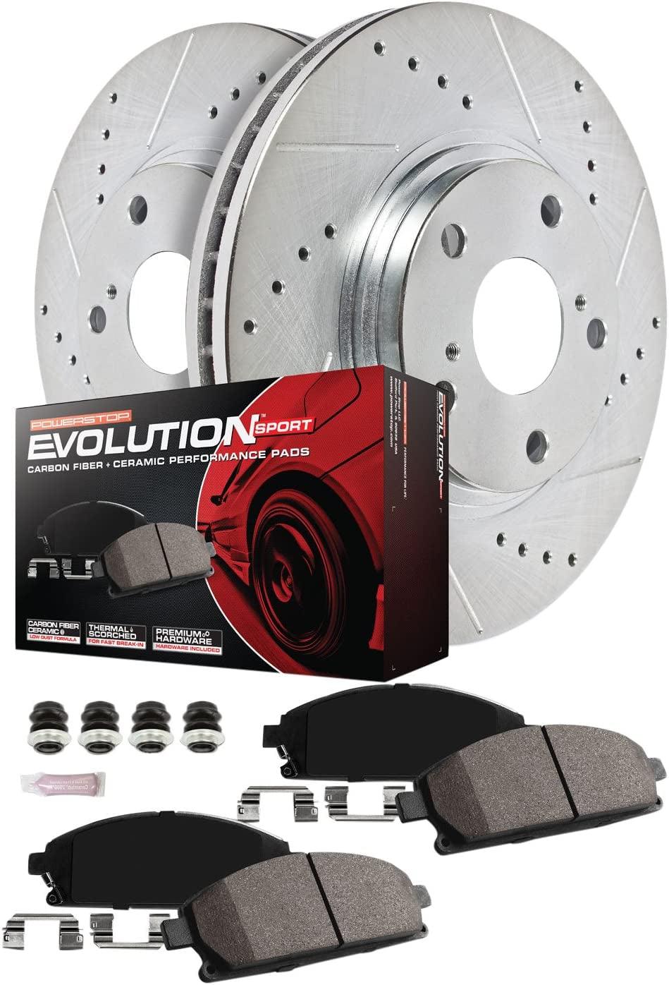 The Power Stop Z23 Evolution Sport Brake Upgrade Kit makes it easy to increase the braking power of your daily-driver with quality components engineered to work together. Designed as a true upgrade over stock brakes, this kit will reduce brake dust & elimate noise so you can ride in comfort. Let Power Stop simplify your brake job by including everything you need in the box: perfectly matched drilled & slotted rotors, Z23 Evolution Sport carbon-fiber ceramic brake pads, upgraded hardware, and high performance lubricant.