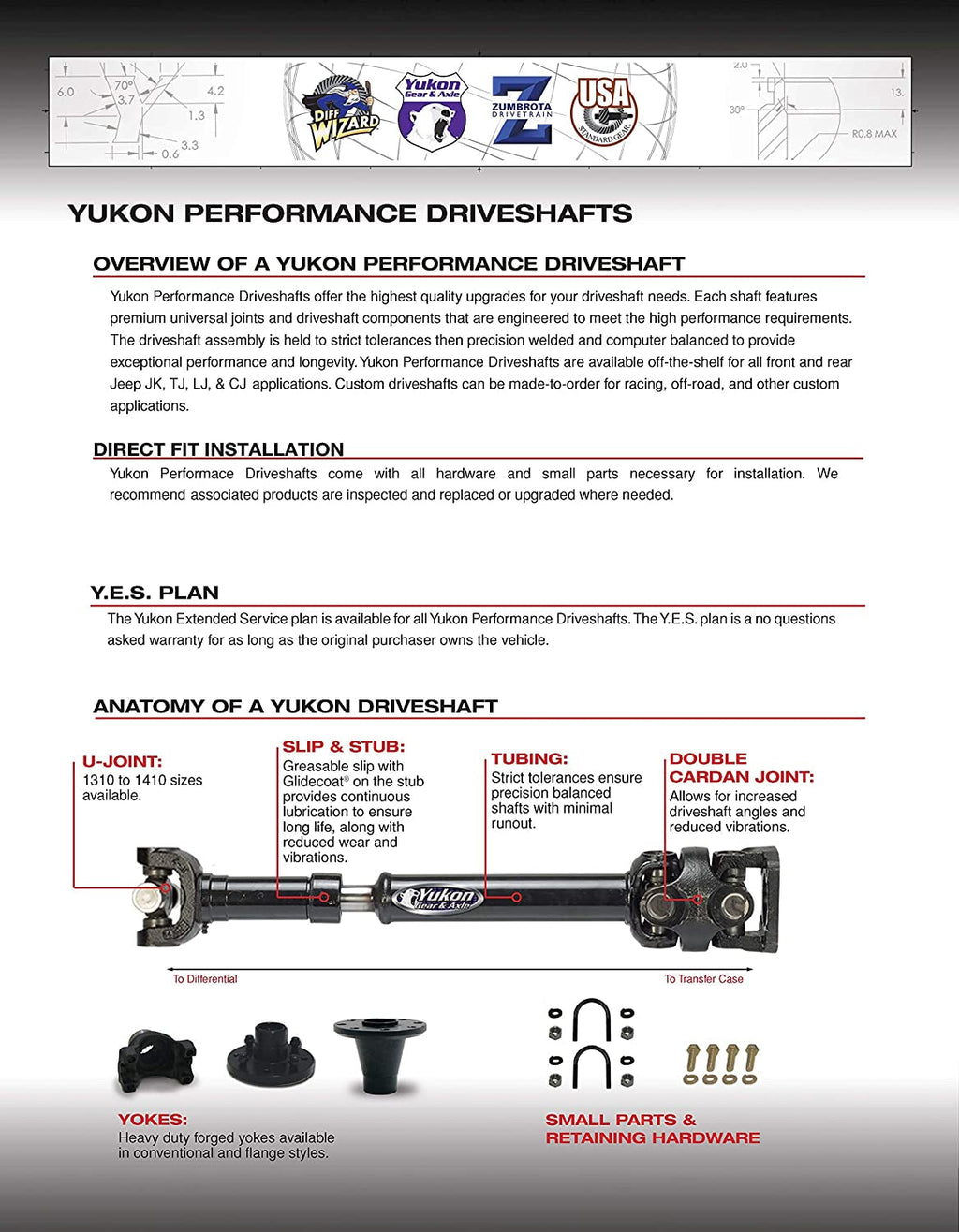 Performance Driveshaft's from Yukon Gear & Axle are specifically designed and manufactured to meet the rugged demands of off road use. Providing an upgrade over stock drive lines, this complete drive shaft assembly comes with everything you need for an easy, bolt-on install in your Jeep Wrangler JK. Yukon Heavy Duty driveshaft's are engineered to accommodate the increased driveline angles that result from the addition of lift kits and larger tires to your JK.