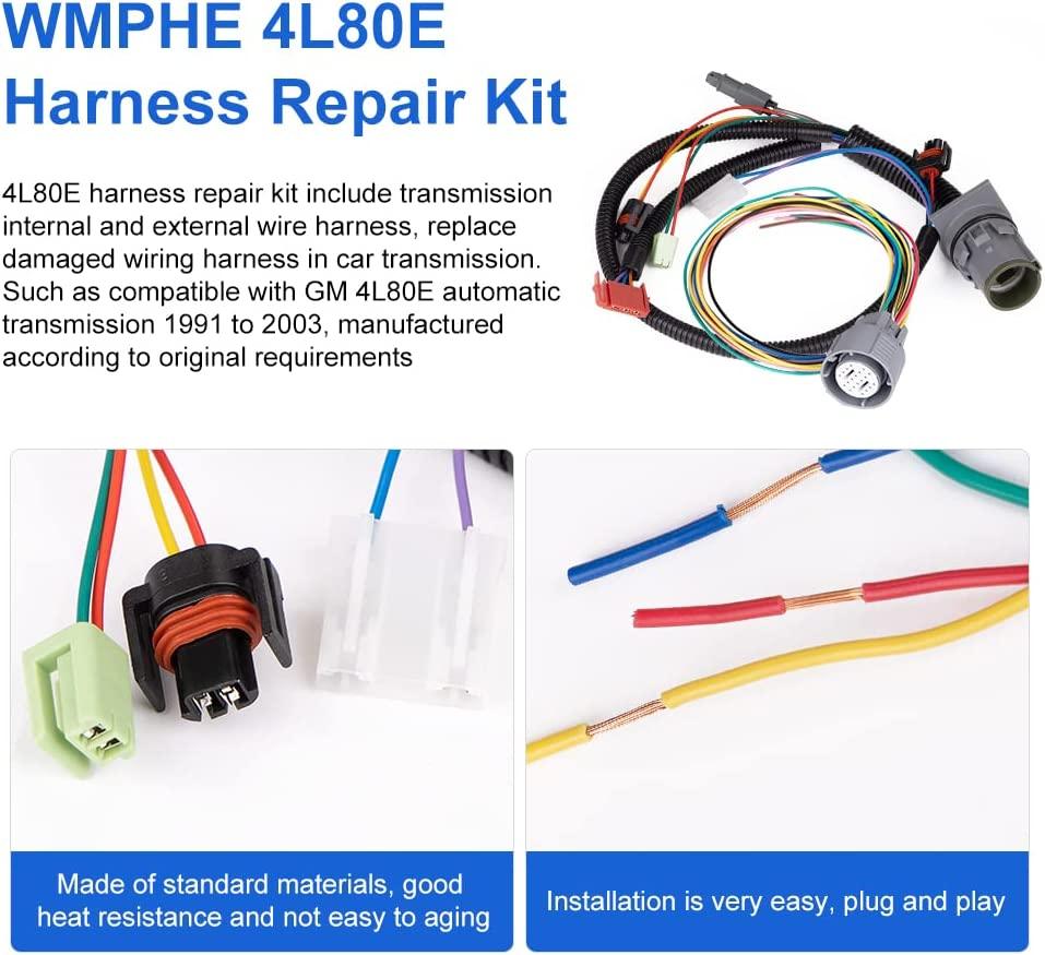 Make sure this fits by entering your model number. WMPHE 4l80e transmission internal and external wire harness repair kit compatible with GM 4l80e automatic transmission 1991 to 2003. Compatible with all models with the 4l80e transmission, will not work for Jaguar, Bentley or Rolls Royce This is internal and external updated wire harness kit, with temperature sensor. The gearbox wiring harness, in addition to replacing the old wiring harness, can also repair the temperature sensor at the same time. Match original equipment, plug and play, easy to replace, OEM anastomoses can be directly replaced, simply remove your original damaged harness to install Replacement for OEM part numbers: 350-9000, 350-0032, 350-0033, 34445EK, D34446, 34446K, 34446BK, K33869A, 24200161, 24222798, 4241218, 34446, 34446AK, 34985, 24230344, 41756DR, 33869B All wires and terminals have been quality checked at the factory to ensure continuity of all terminals and heat and oil resistance of the wires. All wires are produced with automotive spec wire, installation standard, professional installation is recommended This is the 4l80e harness repair kit for multiple models of car module wiring, please check all aspects of the information carefully before buying to determine whether it is suitable for you