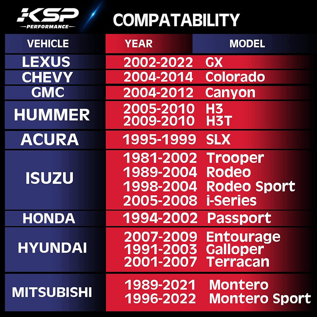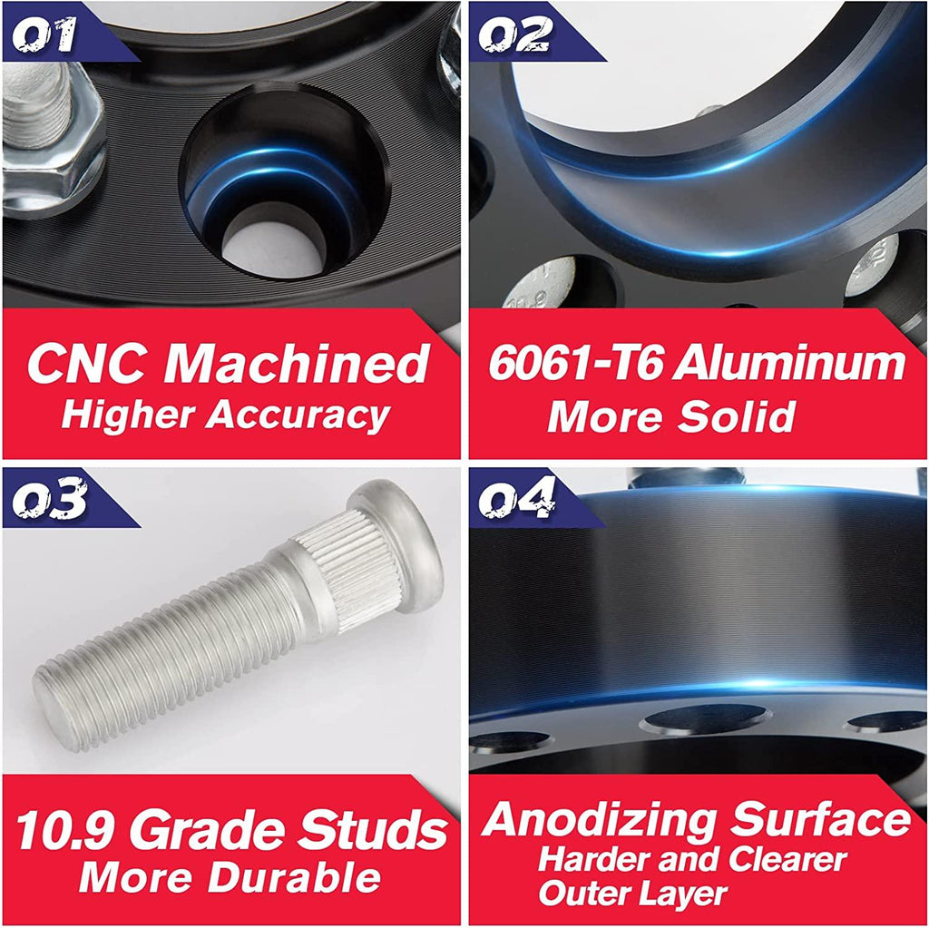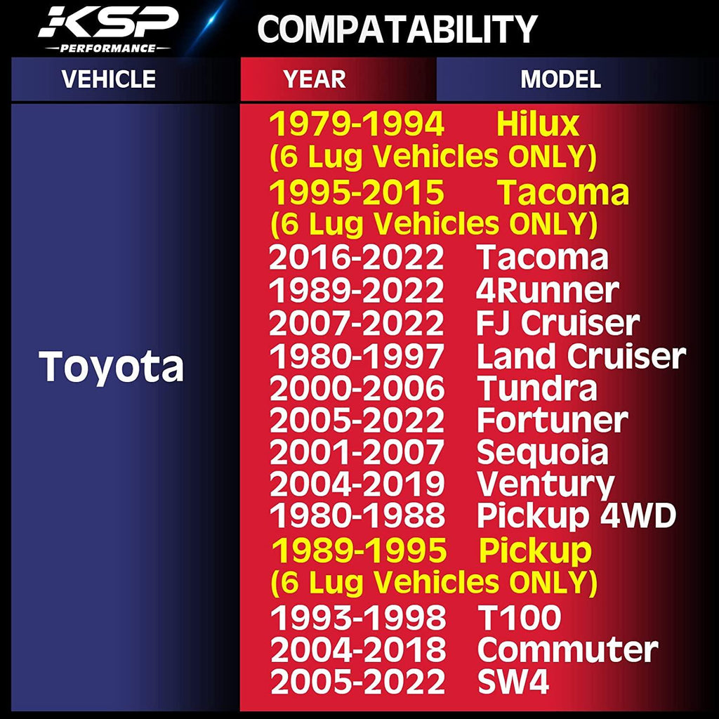 Make sure this fits by entering your model number. Universal Fitment: 1995-2021 Tacoma, 2000-2006 Tundra, 1989-2021 4 Runner, 2007-2020 FJ Cruiser, 1982-1997 Land Cruiser, 2001-2007 Sequoia, 1993-1998 T100, 2004-2012 Chevy Colorado, 2004-2012 GMC Canyon, 2005-2021 Fortuner, 2004-2019 Ventury, 2002-2009 GX470, 2010-2021 GX460 Specification: Bolt Pattern:6x5.5"(6x139.7mm), Hub Bore:108mm, Thickness:2"(50mm), Stud/Nut Thread Pitch:M12x1.5, Recommended torque: 72-80 FT/LBS, Quantity: 4pcs black spacer and 24pcs open ended nuts Build Quality: The 6x5.5 wheel spacers are fitted with extended open ended lug nuts, safer than other 2" spacers. Made from the forged 6061-T6 aluminum billet, stronger than casting. Heat treated and hardened 10.9 grade geomet bolts(with SGS Standard),not easy to break off and strip. Black anodized surfaceare provides additional resistance to corrosion Aggressive Driving Experience: The 6x139.7mm lug centric spacers can move your wheels 2" further out from the wheel hub, allow for larger tire installation to the vehicle. Installing the wheel adapters can fix brake caliper clearance issues, correct tire friction issues, increase cornering stability, give your vehicle a more aggressive stance Warranty: Please recheck your vehicle compatibility (year/make/model) in the product description before purchasing the wheel spacers. We offer a "30-day refund, 24-momth free replacement" service. If you have any questions, please feel free contact us, we will provide you with the most satisfactory solution