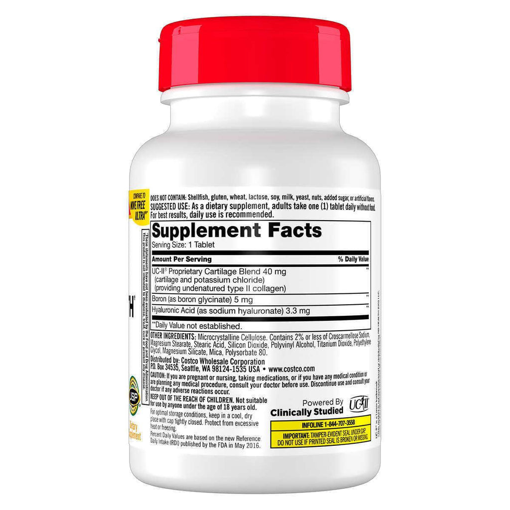 Kirkland Signature Triple Action Joint Health features UC-II(collagen with undenatured type II collagen). Just one tiny pill daily helps support joint mobility, flexibility and comfort, as well as helps to preserve joints and maintain cartilage. It also contains boron to help maintain bone health and hyaluronic acid, which exists naturally in your joints. UC-II is sourced and manufactured in the USA.