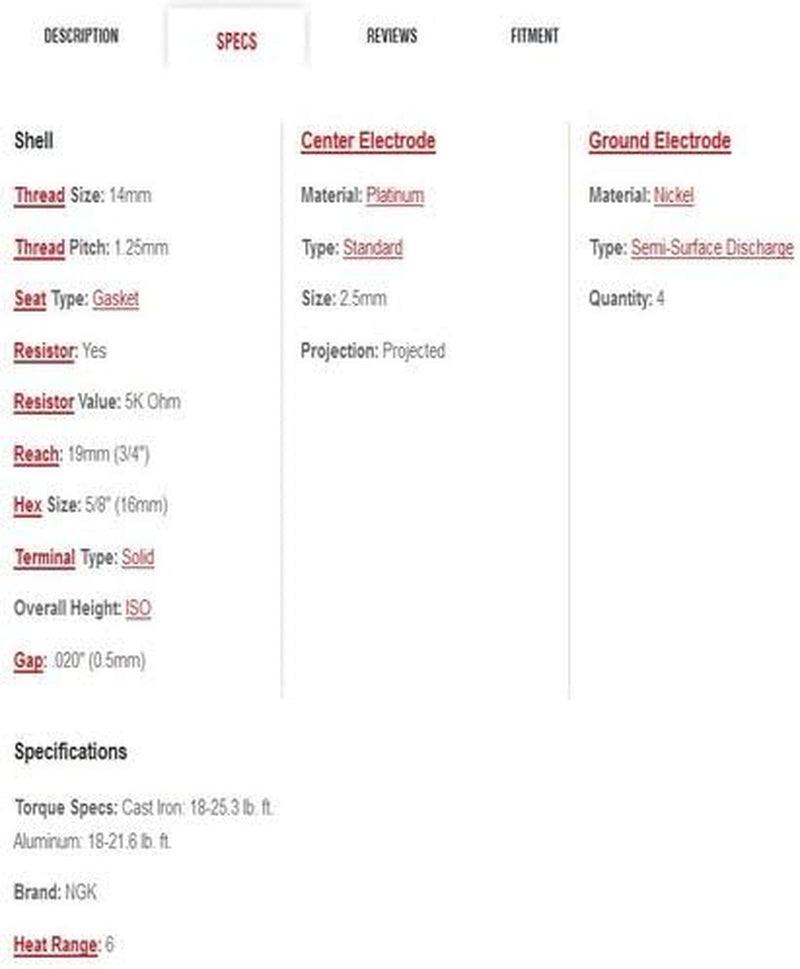 NGK Laser Platinum Spark Plugs are engineered to offer excellent fuel ignition and enhanced throttle response. They are built to OEM specifications and feature trivalent metal plating which provide long lasting durability and protection against anti-seizing. These spark plugs include a laser welded platinum center electrode tip offering faster starts and quicker acceleration. They feature a platinum disc welded behind the ground electrode providing enhanced fuel economy and reduced emissions.