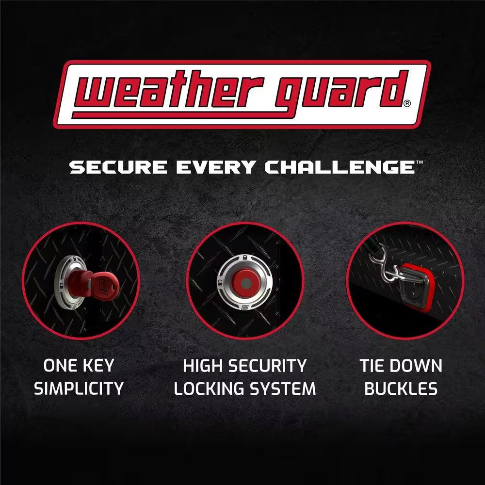 Introducing the re-designed Weather Guard Saddle Box, featuring 1-key Simplicity, Improved High Security Locking System, and now PowerSync Capable. The Model 131-52-03 is a low profile aluminum truck tool box for compact trucks and is powder coated in a textured matte black ARMOR TUF finish ensuring years of dependability. The box features the new push button lock that can code multiple boxes on a truck or entire fleet to the same key. The improved high security locking system provides unmatched protection. The box is now compatible with the new PowerSync interior lights and remote keyless entry accessories.