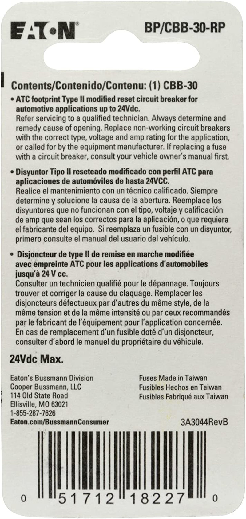 30 amperes For 12 Volt applications Easy to install Bussmann Type-II ATC Footprint Circuit Breaker is designed to fit in any ATC...