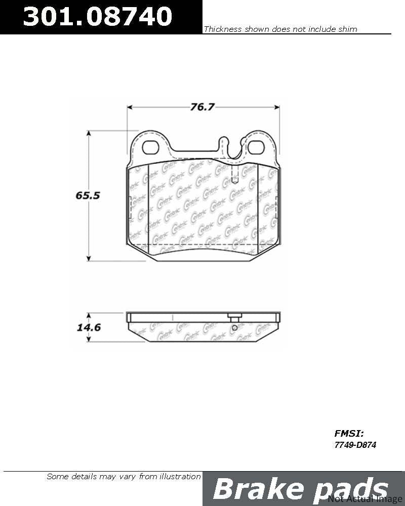 Specifications: Part Category: Disc Brake Pad Brand: Centric Manufacturer Part Number: 301.08740 Vehicle Position: Rear Placement on Vehicle: Rear Label: Centric Premium Ceramic Disc Brake Pad Sets Product Type: Factory Replacement Type: Disc Brake Pad Number of Pieces: 1 Outer Pad Friction Material Thickness: 14.6 Pad Wear Sensor Included: No Friction Material Composition: Ceramic Mounting Hardware Included: Yes Pad Shims Included: Yes Friction Material Attachment: Integrally molded Pad Quantity: 4 Prepared For Pad Wear Sensor: Yes Outer Pad Height: 2.579 Outer Pad Height: 65.500 Inner Pad Height: 2.579 Inner Pad Height: 65.500 Outer Pad Width: 3.020 Outer Pad Width: 76.710 Inner Pad Width: 3.020 Inner Pad Width: 76.710 Outer Pad Overall Thickness: 0.575 Outer Pad Overall Thickness: 14.600 Inner Pad Overall Thickness: 0.575 Inner Pad Overall Thickness: 14.600 Hardware Kit Number [cntrc]: 117.35026 Inner Pad Height mm: 65.5 Inner Pad Width mm: 76.7 Outer Pad Height mm: 65.5 Outer Pad Width mm: 76.7 Weight [cntrc] kgs: 1 Weight [cntrc] lbs: 2.20 Important Information: