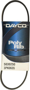 The Dayco Poly Cog belt is 25" long and .40" wide with three ribs. This grooved design runs cooler and with a lot less noise from slippage. This belt is designed to perform better under overload situations.