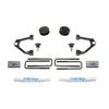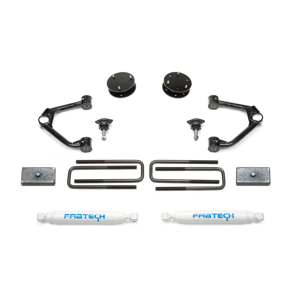 This quality Upper Control Arm system provides a 3.5in increased ride height over stock without creating suspension bind at full droop. Lift is accomplished with spacers that utilizes the factory coilover shocks for a stock ride. The Fabtech Upper Control Arms address the geometry of the front suspension with the new ride height for proper align-ability. Heavy duty ball joints allow for extended travel to eliminate binding. Due to the GM suspension geometry there are no differential drop brackets required for the CV axles to operate properly. Rear lift comes from 1in blocks and u-bolts. Value priced system with Fabtech quality. Increased ground clearance. Extended range upper ball joints provide a smooth quiet ride. Increased fender clearance compared to a Leveling Kit for 33in tall tires. Suspension can be restored to stock. Easy installation. Includes rear Performance Shocks.