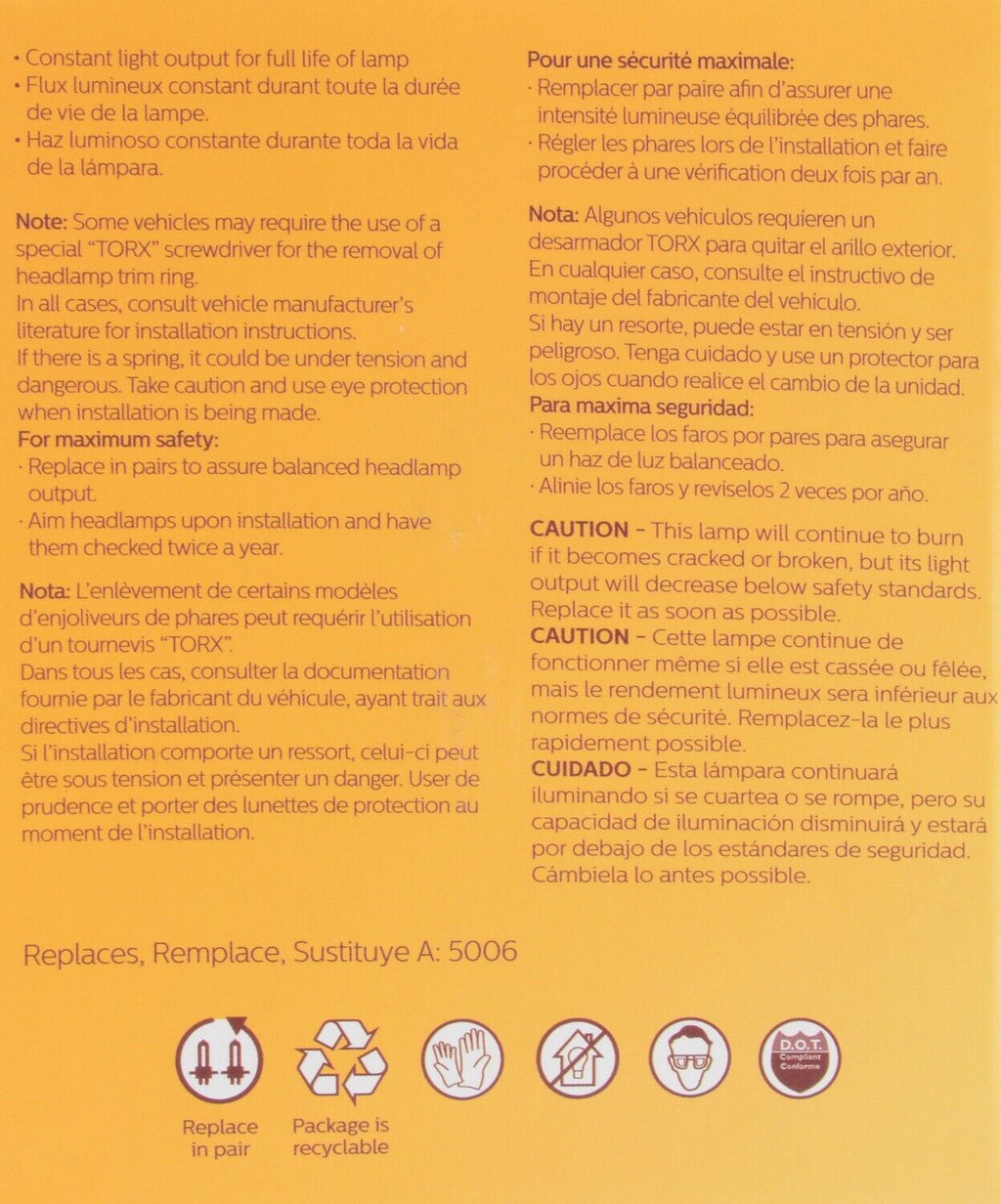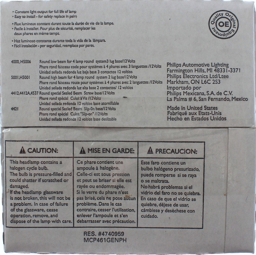 Specifications: Part Category: Headlight Bulb Brand: Phillips Manufacturer Part Number: H5006C1 Vehicle Position: Low Beam Placement on Vehicle: Low Beam Label: Standard - Single Commercial Pack Product Type: Factory Replacement Type: Headlight Bulb Diameter: 4 Halogen: Yes DOT Approved: Yes Filament Quantity: 2 Beam Type: Low beam Street Legal: Yes Bulb Color: Clear Bulb Base Type: 3 contact lugs Bulb Material: Glass Bulb Technology: Halogen Bulb Finish: Clear Amperage Rating: 2.73/2.73 Bulb Type: Standard sealed beam Filament Type: C-6 Length: 4 Voltage: 12.8 Wattage: 35/35 Brand Label: Standard - Single Commercial Pack Important Information: