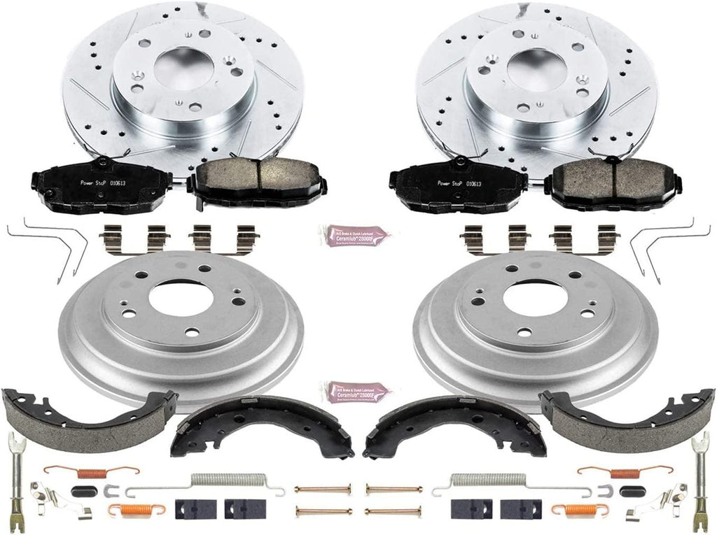 Power Stop Performance Pad, Rotor, Drum and Shoe Kits include 2 Power Stop Drilled Slotted brake rotors, a set of Power Stop Z23 brake pads, a set of Power Stop Evolution Premium Coated brake drums, a complete set of brake shoes, the spring/hold-down kit, and adjusters (where available). If you need a fast, easy and affordable solution for better braking, then you need a Performance Brake Kit.