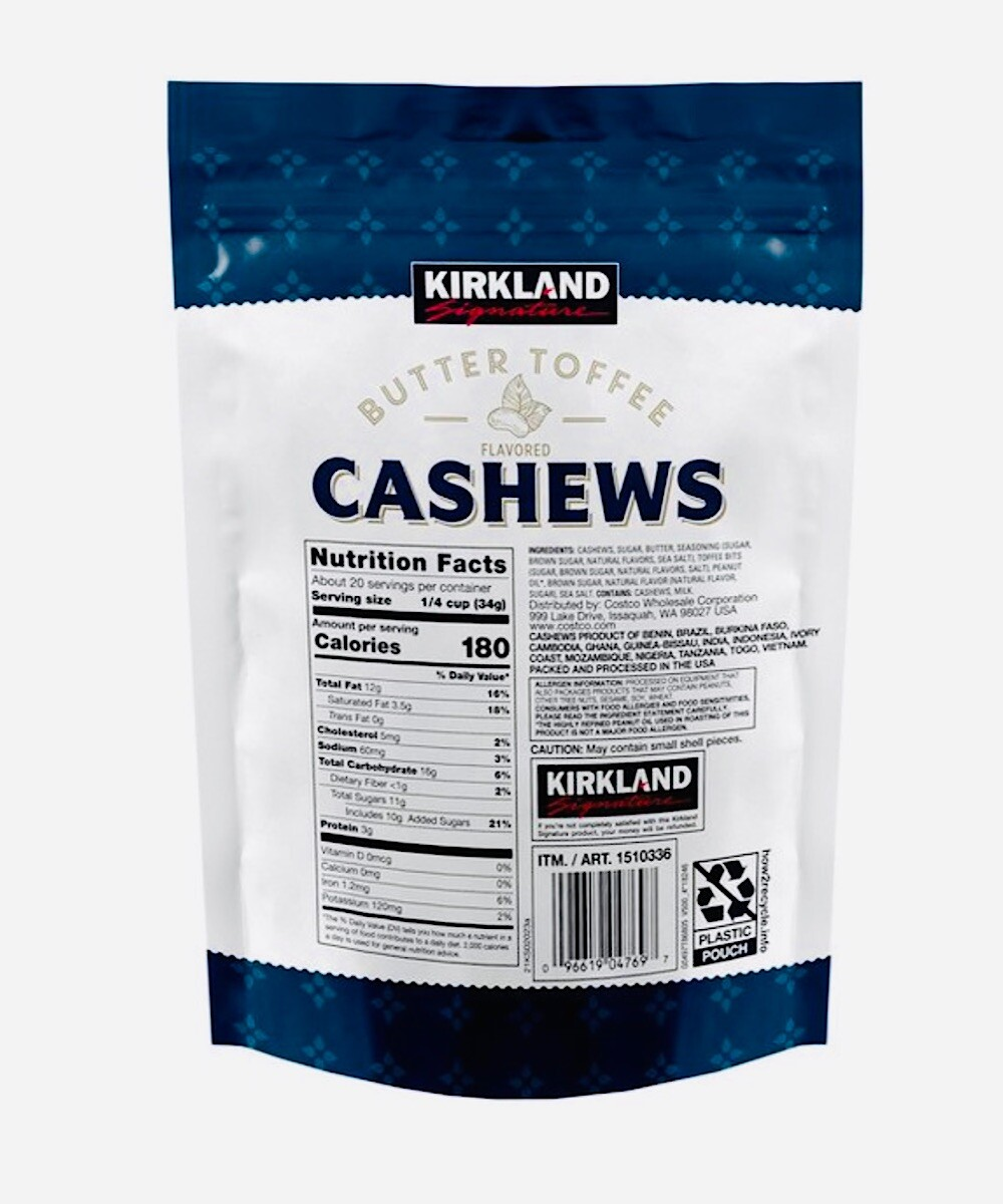 Kirkland Butter Toffee Flavored Cashews 24 Oz Bag - 2 Pack.