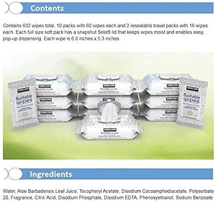 Kirkland Signature Moist Flushable Enhanced Cleansing & Freshness Ultra Soft Hypoallergenic Plant-Based Wipes - 632 Count