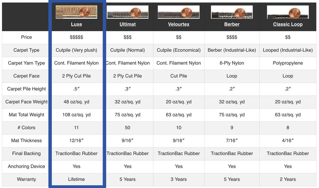 | 1958 Chevrolet Bel Air | Luxe Most Luxurious/Plush $$$$$ | Ultimat Best Selling $$$ | Velourtex Most Economical $$ | Berber Berber Carpeting $$$$ | Classic Loop Looped Carpeting $$ |