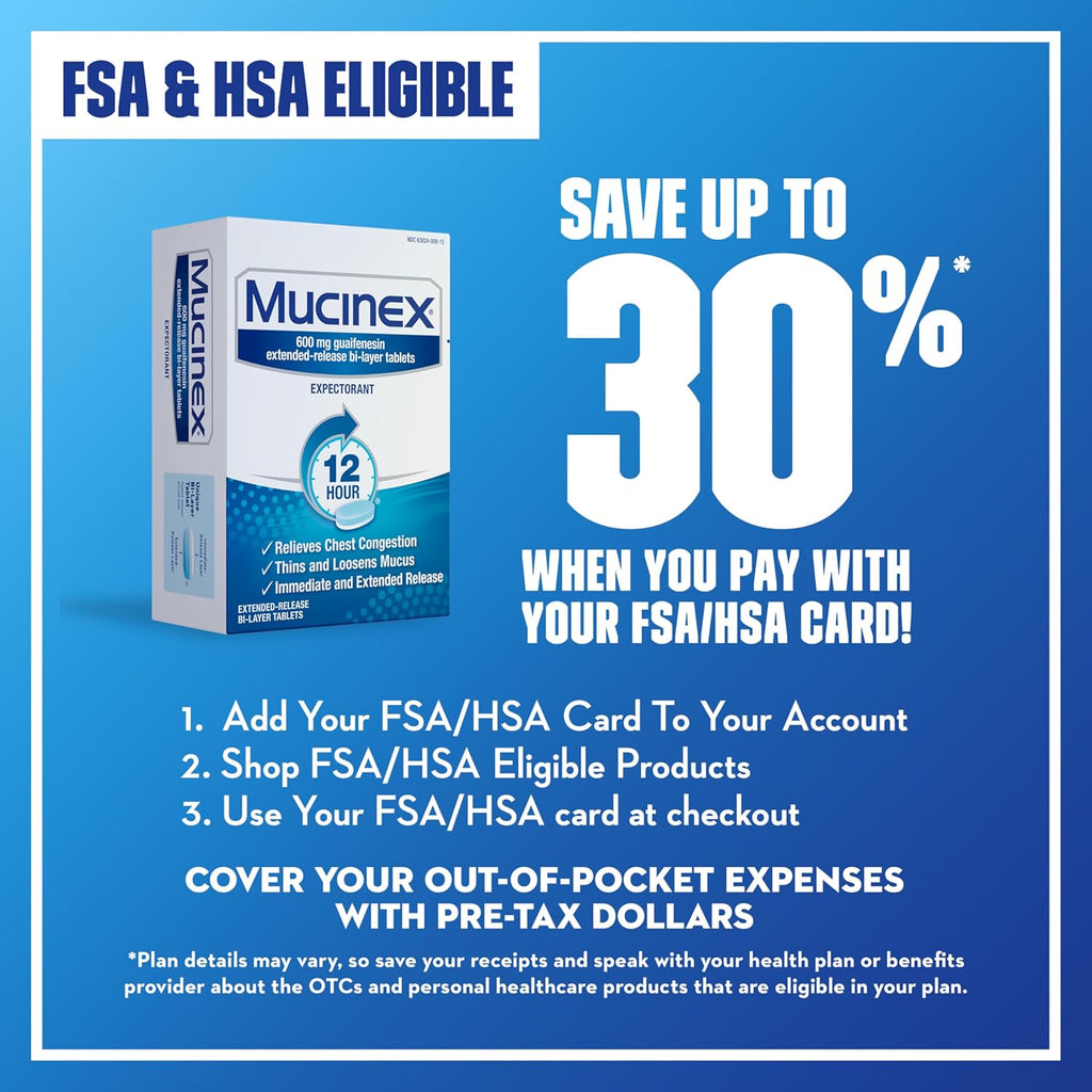 Show more Are you searching for reliable chest congestion relief for adults? Look no further than Mucinex 12 Hour Expectorant for excess mucus relief. Featuring a robust 600mg of guaifenesin, this top-notch expectorant thins and loosens mucus thereby making coughs more productive. When the cold and flu season hits, trust Mucinex for powerful chest congestion relief. Our original bi-layer tablet provides immediate and extended-release and lasts up to 12 hours.