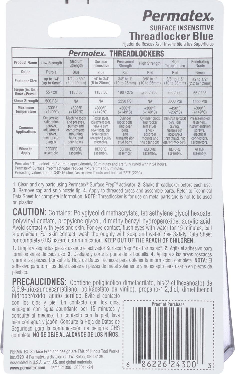 Permatex Surface Insensitive Threadlocker Blue is a medium/high strength threadlocker for general-purpose applications. Especially well-suited for 6mm to 20mm fasteners that have a slight oil film, this threadlocker prevents loosening due to vibration. Oil resistant and removable with hand tools for easy disassembly. Applied as a liquid or gel, threadlockers are superior to conventional lock washers, nylon inserts, and other mechanical devices because they secure the entire fastener assembly against loosening from shock and vibration by filling the space between threaded metal parts, curing to form a tough, adhesive bond and seal. They also seal the threads against leakage, preventing rust and corrosion.