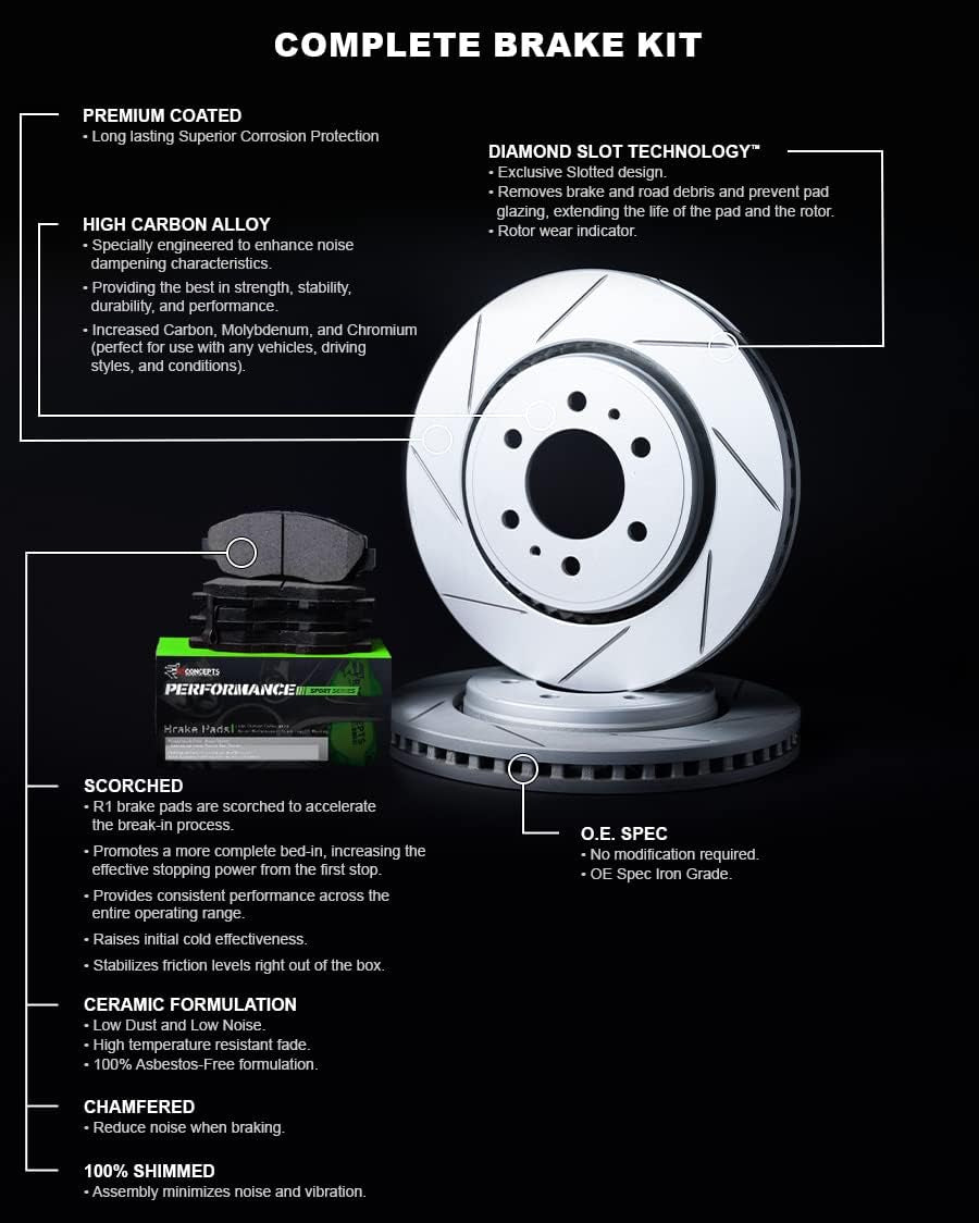 - All-in-One Complete Brake Kit Replacement: R1 Concepts Brake Kit Series comes with (2) high performance brake rotors and (4) performance brake pads.