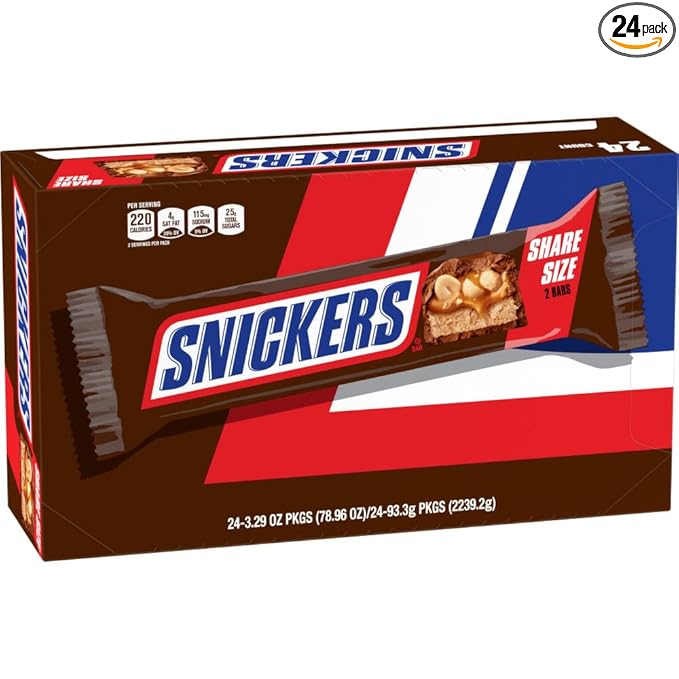 Contains one (1) 24-count box of 3.29-ounce sharing size SNICKERS Chocolate Candy Bar These sharing size candy bars are great for gifts...