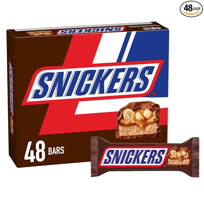 This bulk chocolate candy box includes 48 individually wrapped Full Size SNICKERS candy bars. Unsatisfied? Maybe you just need a SNICKERS. Packed with roasted peanuts, caramel, and nougat covered in milk chocolate, SNICKERS candy bars make your day go from "Meh" to "Satisfying" in just one bite. Individually wrapped bulk Full Size candy bars are ideal for keeping the pantry stocked for movie night with the family and small celebrations with friends. These satisfying candy bars make great on-the-go treats, pack them in lunches, or take them along on family road trips to enjoy peanut-packed chocolate candy on the road. Bulk SNICKERS candy bars are a tasty way to share your love of peanut chocolate candy with friends and family. Buying candy bars in bulk ensures you have plenty of chocolate on hand for filling candy bags and candy gift baskets. Be the best house on the block this Halloween when you hand out Full Size SNICKERS chocolate candy to Trick-or-Treaters. Full Size candy bars make great stocking stuffer candy gifts and Easter basket candy. SNICKERS Full Size chocolate candy bars make break time more satisfying. This 48-count bulk candy package is great for filling vending machines, concession stands, and even the office pantry. Stock up and share the satisfying taste of SNICKERS bulk candy with friends, family, and coworkers.