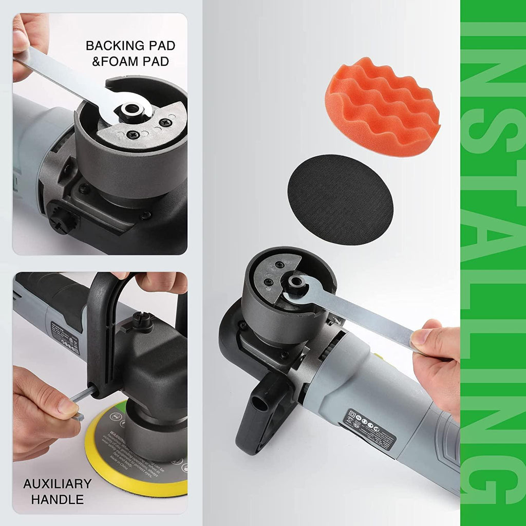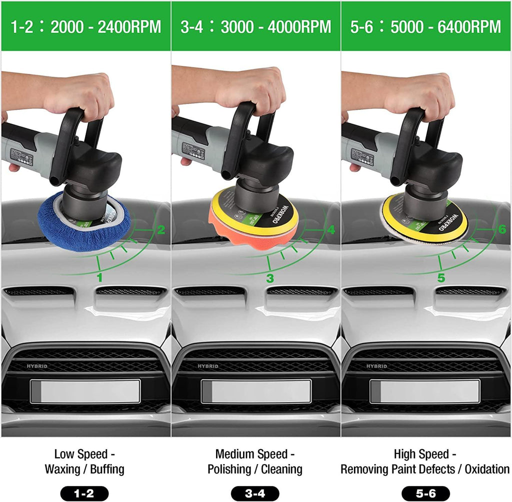 • 7 Variable Speed - 7 level variable speed dial allows you to control speed from 2000 to 6400 OPM (No Load Speed) according to different applications; Low speed for waxing and buffing; Medium speed for polishing and cleaning while high speed for removing paint defects and oxidation