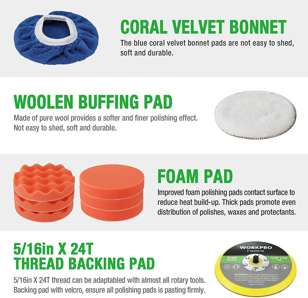 • WORKPRO random orbital buffer polisher is Perfect for polishing and removing swirls, scratches, and defects from all painted vehicles, with a wide range of applications, such as waxing floor, car polishing, repairing scratches, or polishing the surface of any smooth object���With 6" backing plates & pads, you can also use it on furniture, ceramic, wood and metal