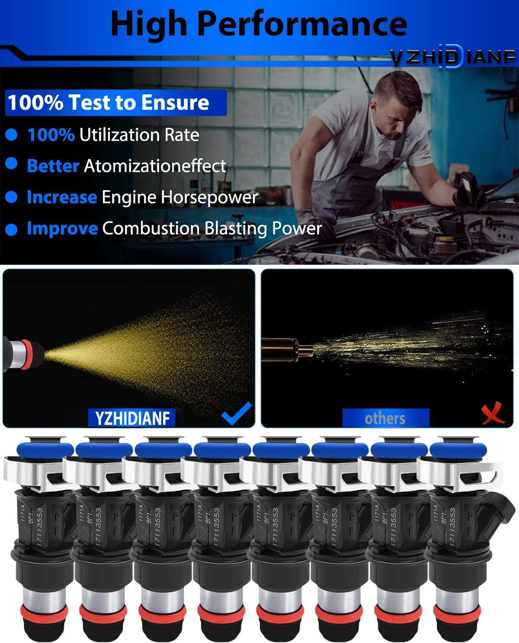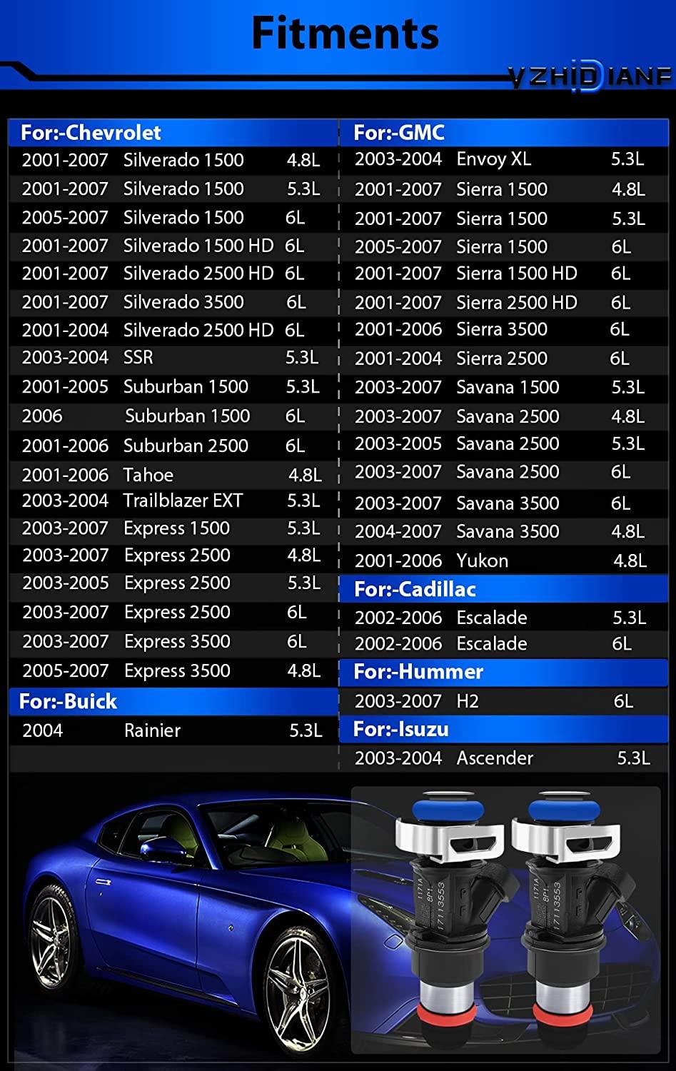 Make sure this fits by entering your model number. �����������������������Application���Compatible with 2001 2002 2003 2004 2005 2006 2007 For:-GMC Sierra Yukon For:-Avalanche For:-Silverado For:-Suburban For:-Cadillac Escalade For:-Buick Rainer 4.8L 5.3L 6.0L V8 �������OEM Numbers���17113698, 17113553, FJ315, FJ10062, 8171136980. Choose the Right Fuel Injectors, Live a Better Life! �������Enhanced Performance���YZHIDIANF Fuel injectors Are Manufactured To The OE Specification To Provide Factory-fresh Appearance And Direct-fit, That Promote Smooth Engine Operation And Balanced Fuel Delivery Reducing Overall Fuel Consumption. No More Miserable Experience With Misfires Or Poor Gas Mileage �������100% Strict Quality Control���All Of YZHIDIANF Fuel Injectors Undergo Strict Quality Control Not Just Before Shipping But Throughout The Production Process. During Each Step Of Production Multiple Quality Control Checks Are Performed to meet or exceed OE (original equipment) fuel injector fit, form, and function and Insure Each And Every Part Lasts For Years To Come �������Preium Quality���PREVENTS CORROSION AND BUILD UP with stainless steel slide and spring assembly, leading to longer service life of fuel injection system.REPLACEMENT FUEL INJECTOR PROMOTES SMOOTH ENGINE OPERATION and optimal gas efficiency; can reduce harmful emissions caused by worn injectors